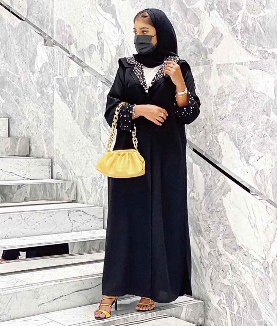 · يمكن اعتماد العباية السوداء المطرزة بصورة عامودية وحول الياقة بصورة تمتد إلى الحافة، مع اختيار فستان باللون الأسود وحقيبة وحذاء أسود، ويمكن ارتداء حجاب بنفس لون التطريزات المتوافرة.