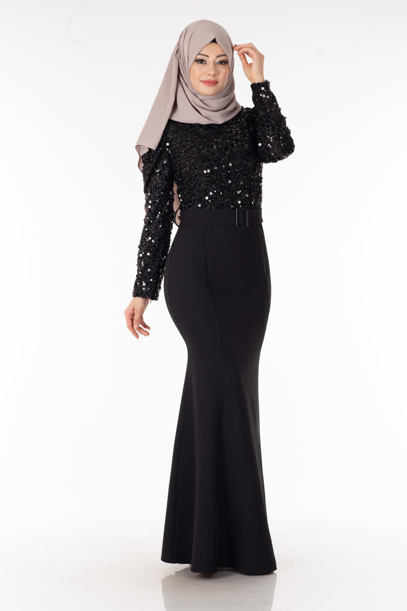 5- تنورة باللون الأسود من قماش الستان ويغطيها من الخارج قماش الأورجانزا باللون الأسود، وتتضمن التنورة حزام عند منطقة الخصر على شكل فيونكة من نفس القماش وباللون الأسود، وتحتوي طبقة الأورجانزا على مجموعة من حبات اللؤلؤ التي تنتشر بصورة عشوائية في التصميم بالكامل.