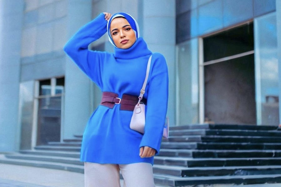 · تايير اللون الأزرق الفاتح: وهو تايير مميز بقطعتين يتناسب مع أكثر من إطلالة للخروج، فالجزء العلوي عبارة عن بلوزة واسعة به زران عند منطقة الصدر للتحكم بغلقه والأكمام واسعة تنتهي بأستيك عند المعصمين وبه كباتشو للرأس، أما القطعة الثانية فهي عبارة عن تنورة بنوعين من القماش حيث إنها مقسمة لجزأين الجهة اليمنى عبارة عن قماش البلسيه والجزء الثاني الأيسر من الشيفون الناعم.
