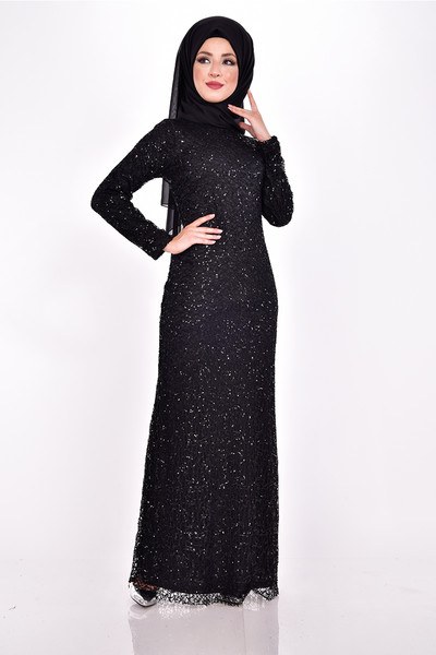2- فستان سهرة ترتر باللون الأسود بأكمام طويلة ضيقة، ويتميز الفستان بتصميم بينسل مع قطعة إضافية (اكستنشن) عند منطقة الخصر من أقمشة الشيفون باللون الأسود، مع حجاب باللون الرمادي.
